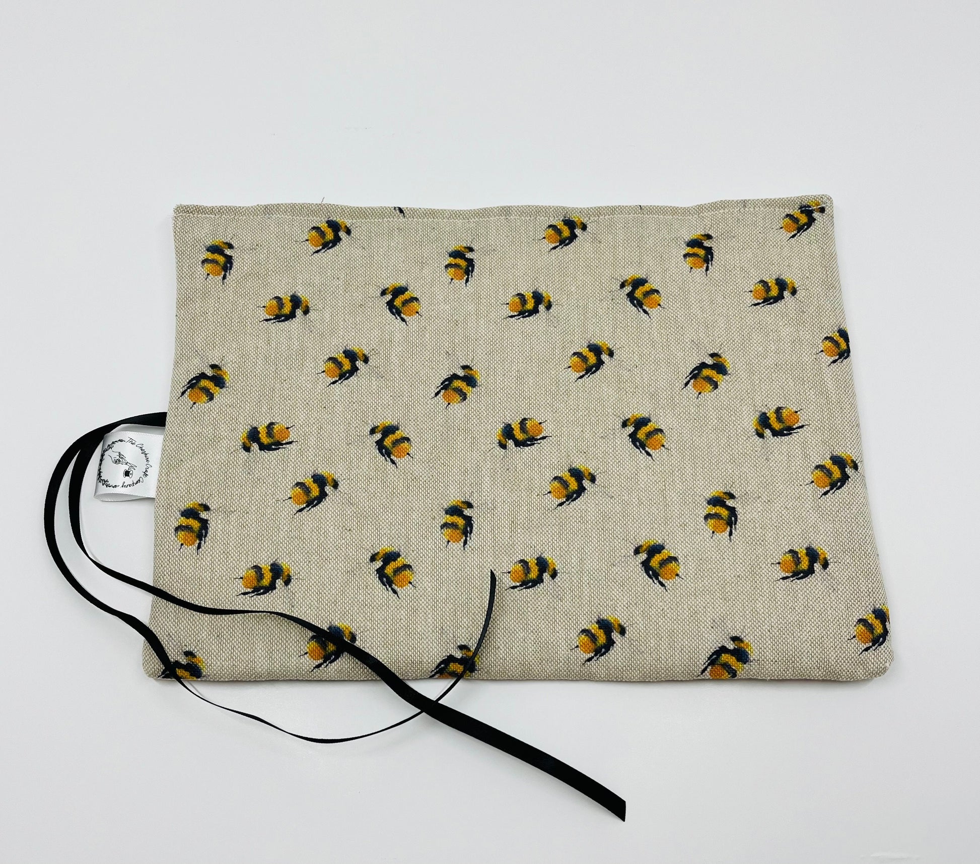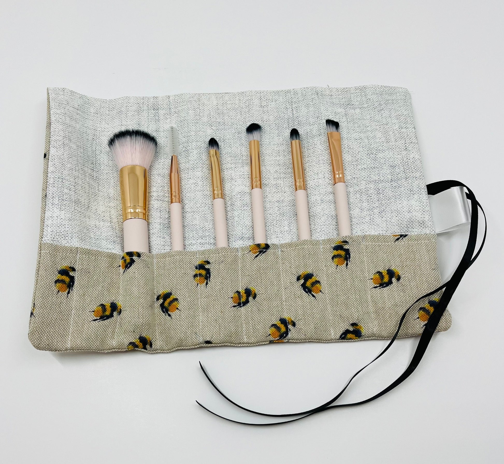 Keep your makeup brushes neat and accessible with our charming Bee Print Makeup Brush Roll. Handmade in the UK from a high-quality cotton/linen mix, this roll is both durable and stylish.