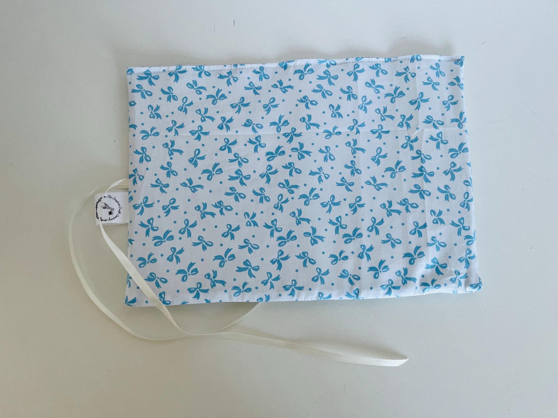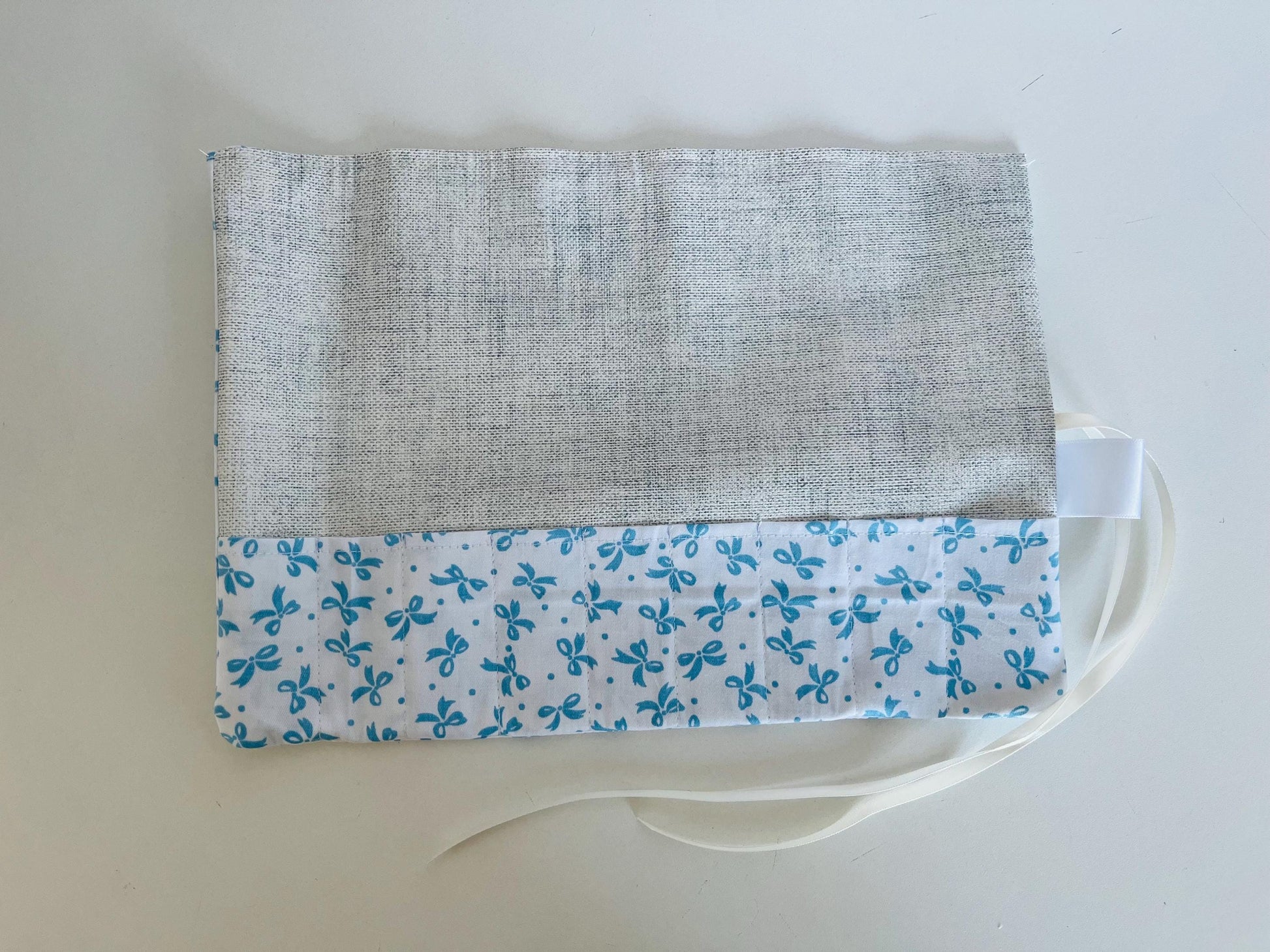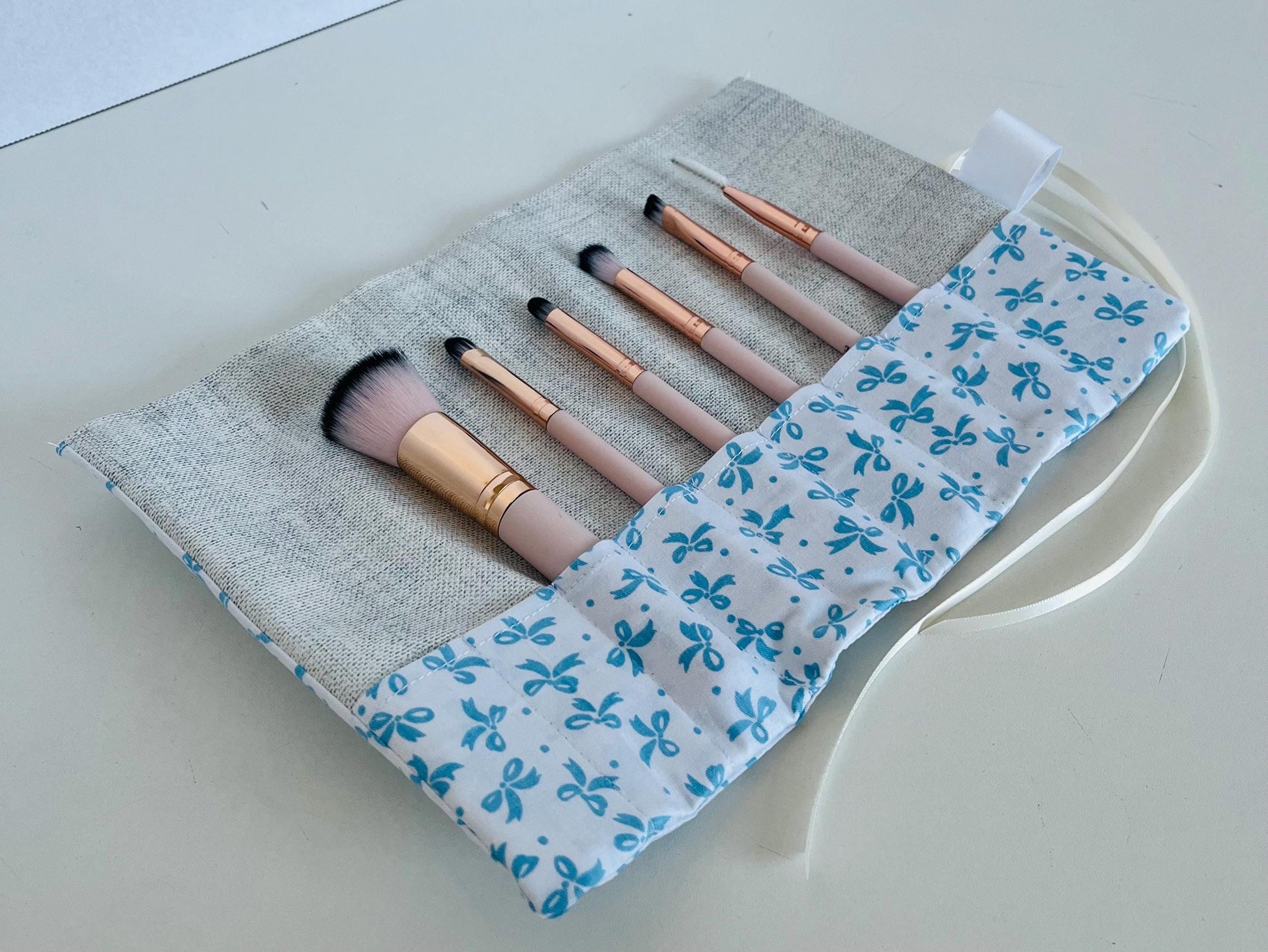 Our Blue Bow Print Brush Roll is a charming, handmade UK creation crafted from 100% cotton fabric.