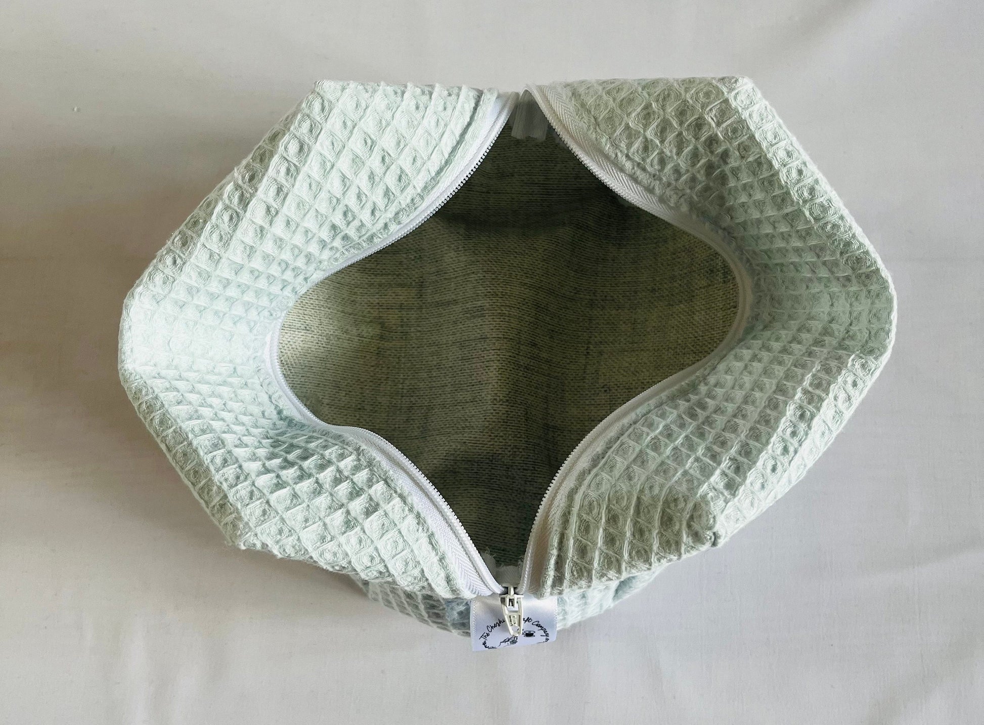 Lovingly crafted from premium waffle/towelling cotton, this 6” x 5” x 5” makeup bag combines charm and practicality.