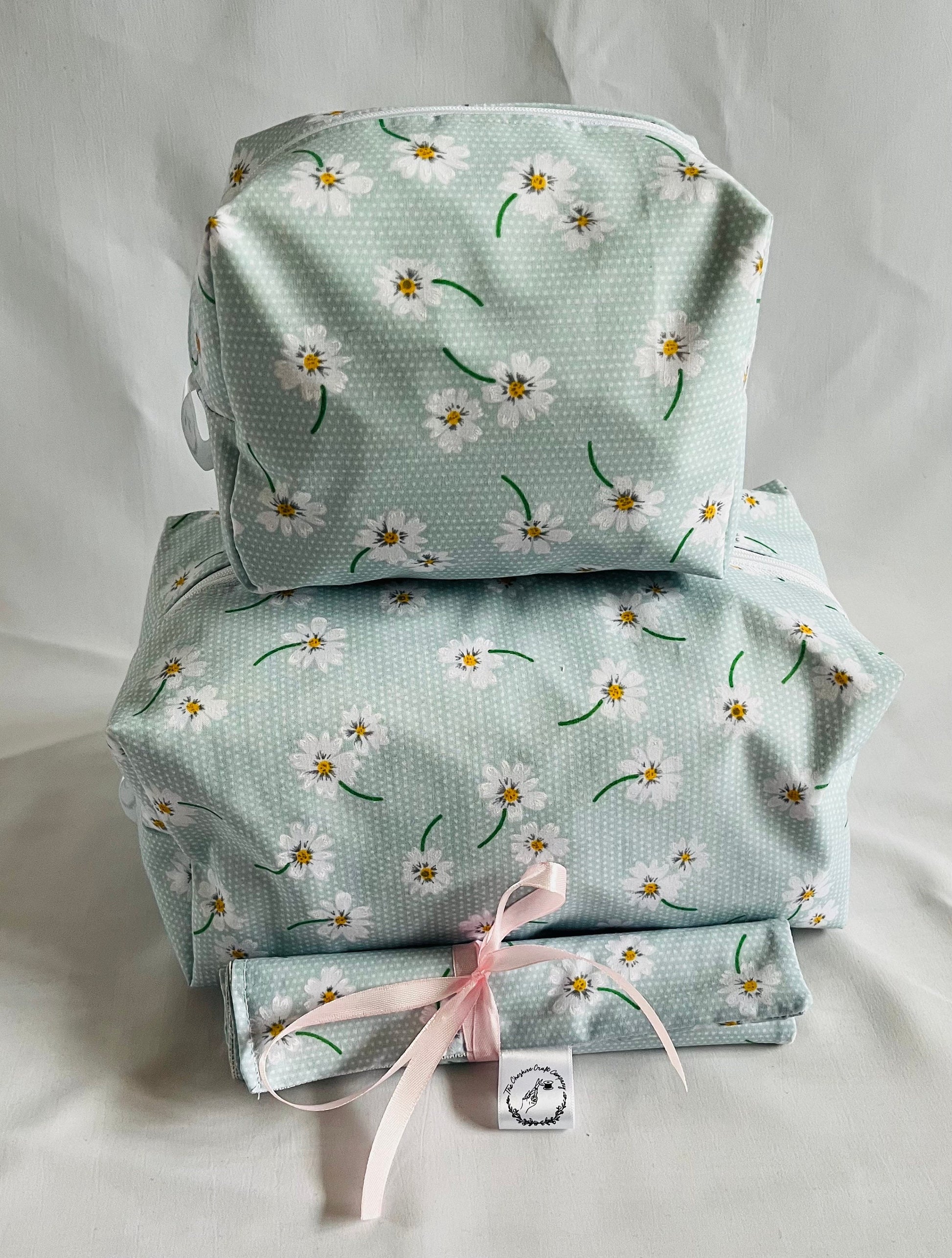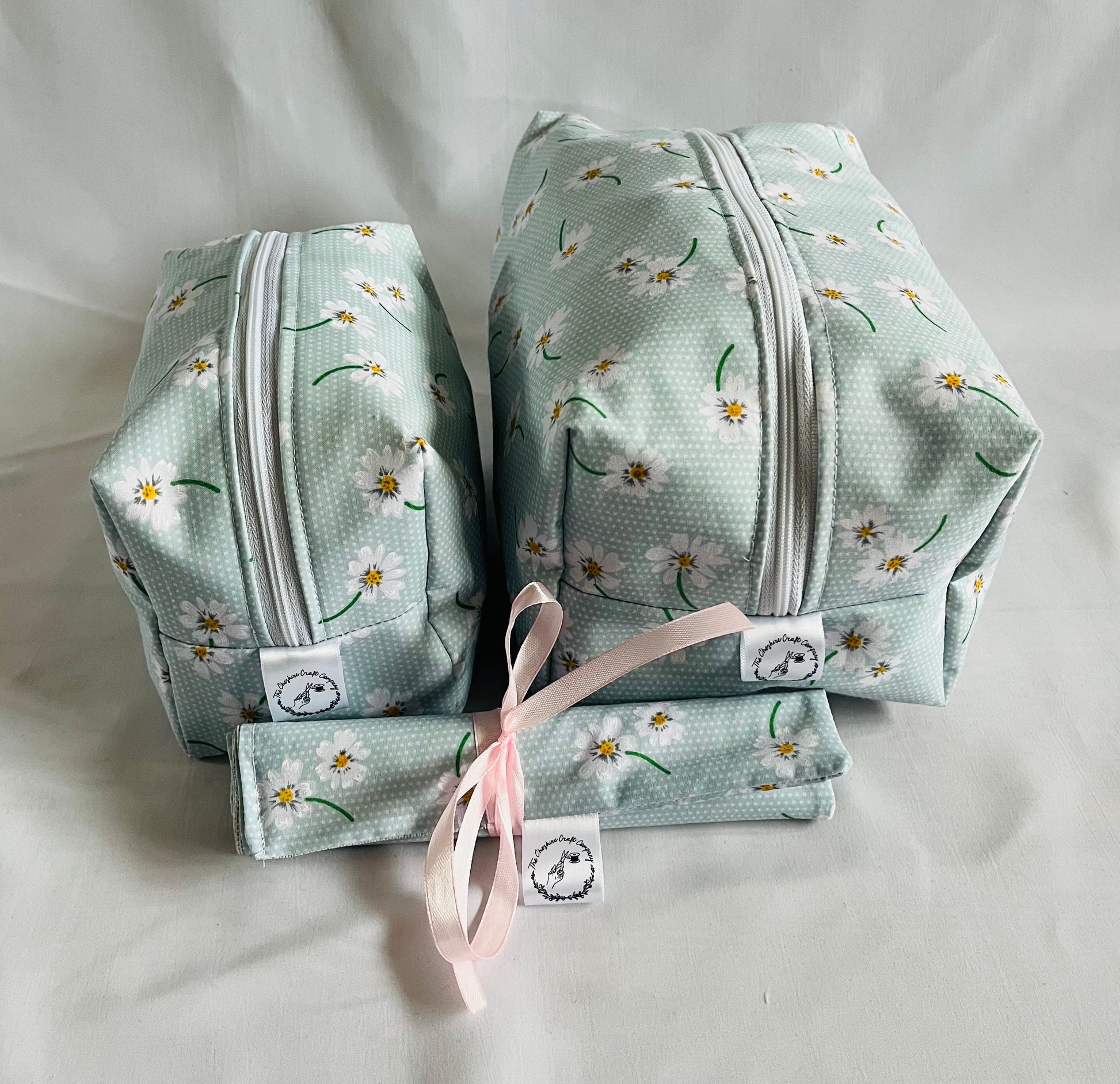Stay organised in style with our Green Daisy Print Travel Set, meticulously handmade in the UK from the finest quality cotton fabric. This complete set includes a large wash bag, a small makeup bag, and a brush roll, providing everything you need to keep your travel or makeup essentials perfectly organised.