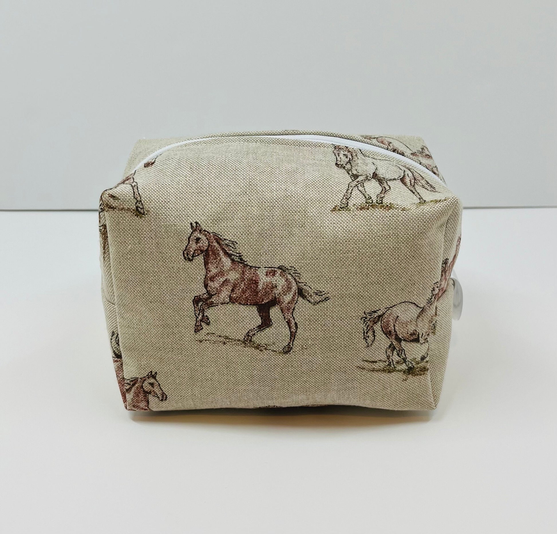 Introducing our Horse Print Makeup and Wash Bag Set, handmade in the UK from premium linen fabric. This set includes a small makeup bag (6” x 5” x 5”) and a large wash bag (9” x 6” x 6”), perfect for organising your travel or beauty essentials.