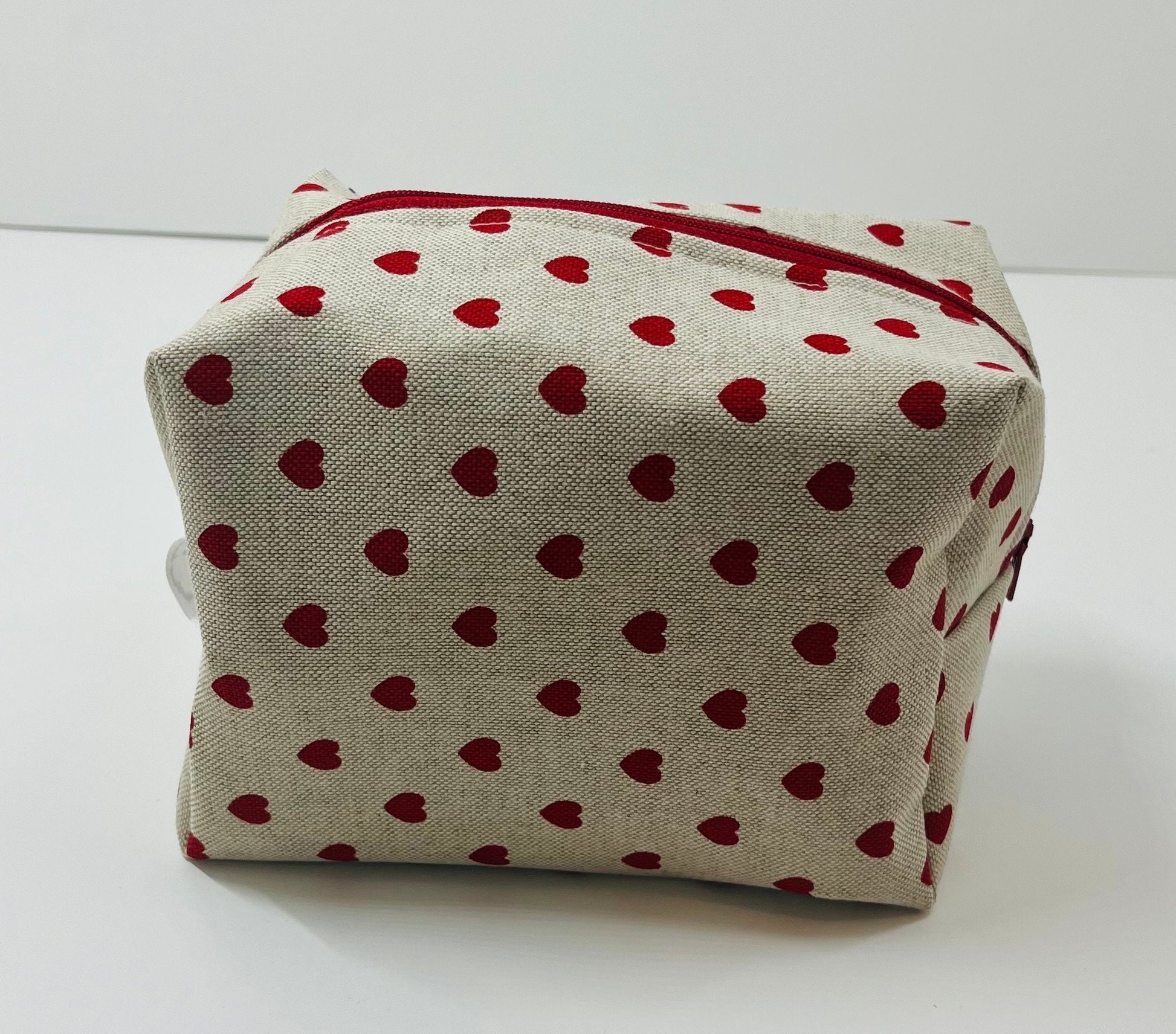 Presenting our stunning Red Love Heart Print Makeup Bag, lovingly handmade in the UK from the finest quality linen fabric. Featuring a charming bee print, this bag adds elegance and personality to your makeup collection.