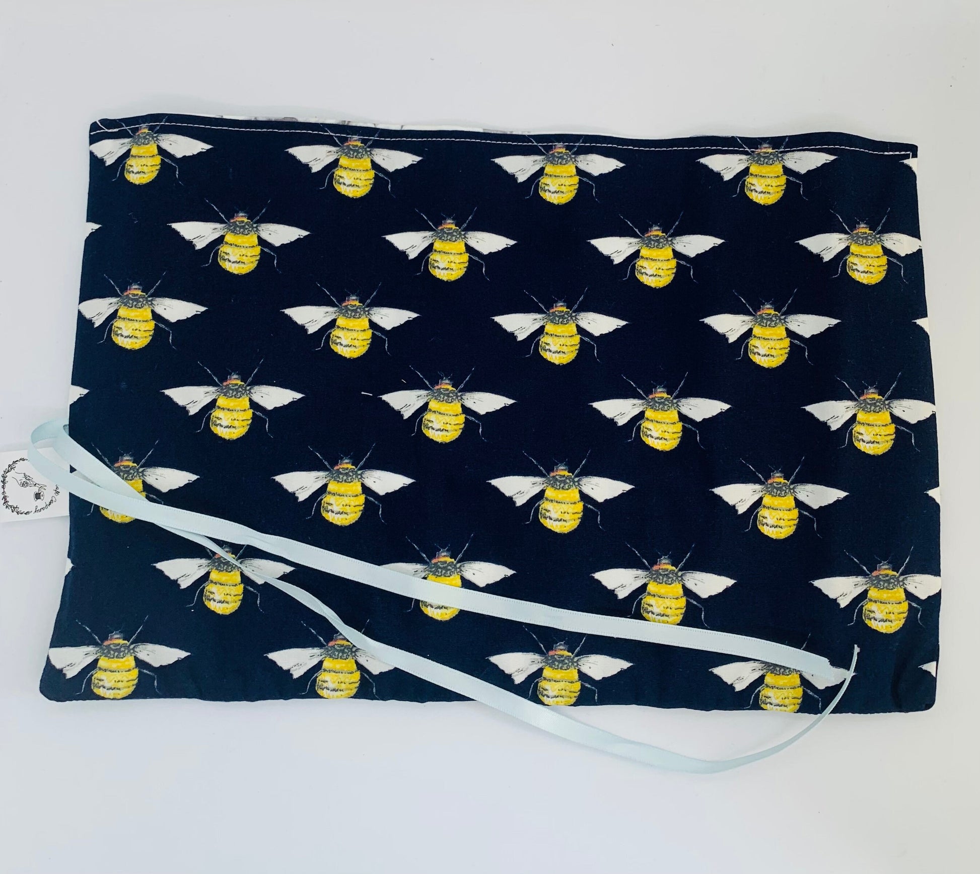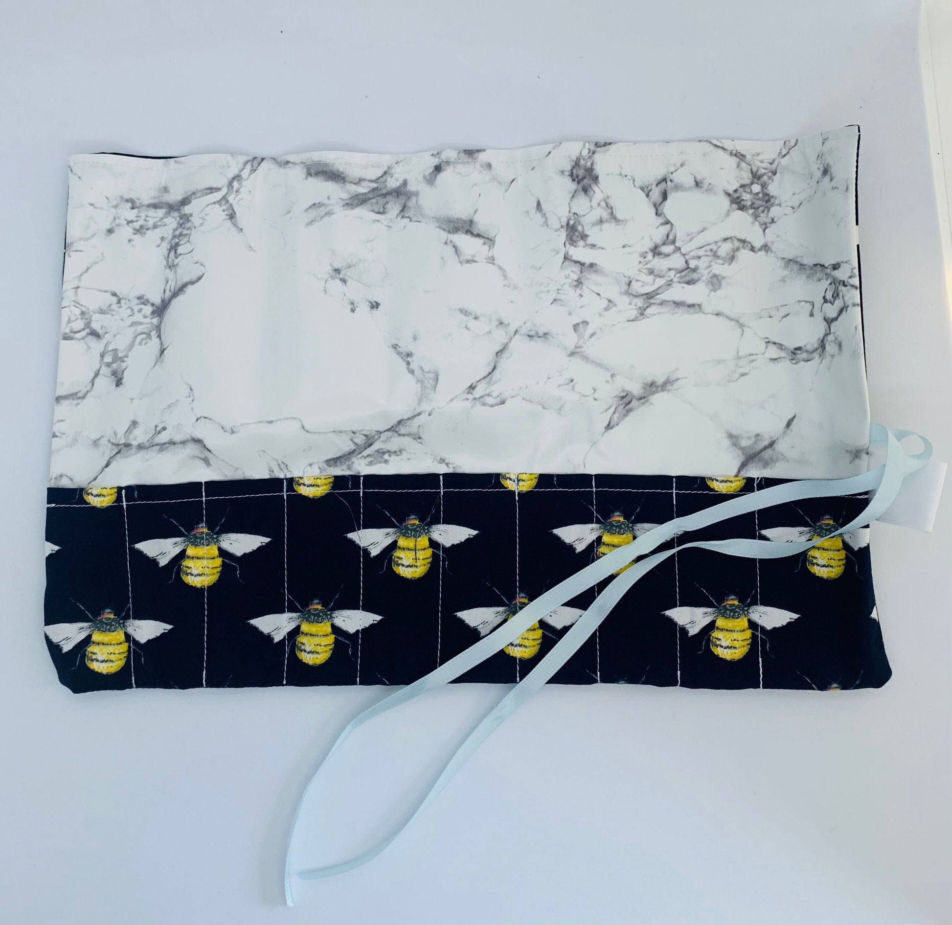 Introducing our Navy Bee Print Makeup Brush Roll, handmade in the UK from high-quality cotton fabric to keep your brushes organised in style.