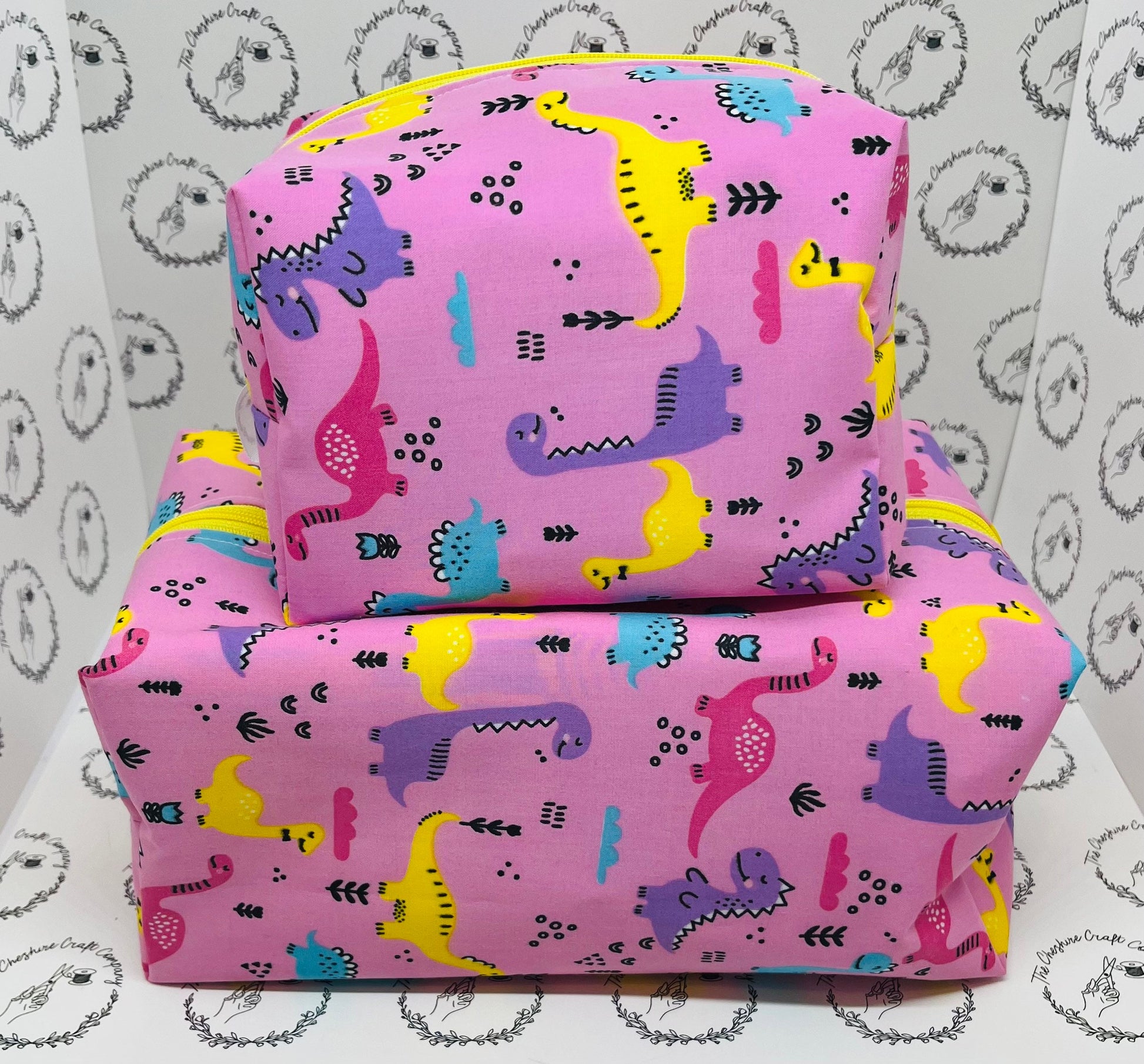Bring a touch of whimsy to your beauty routine with our Fun Pink Dinosaur Print Makeup and Wash Bag Set. Lovingly handcrafted in the UK from the finest quality cotton fabric, these bags combine style, practicality, and a dash of playful charm.
