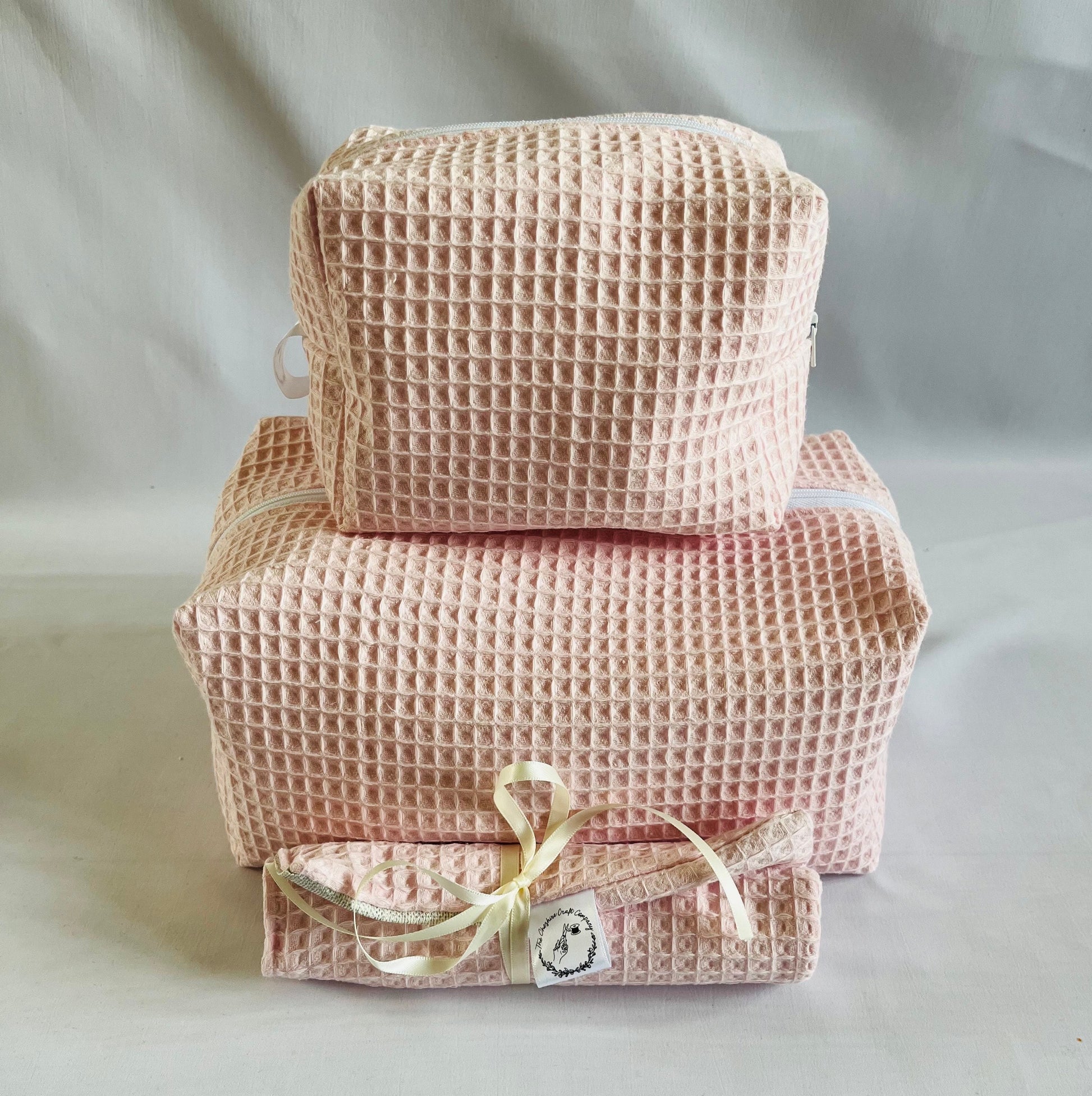 Handcrafted from the finest waffle/towelling fabric, this travel set includes a large wash bag, small makeup bag, and brush roll.