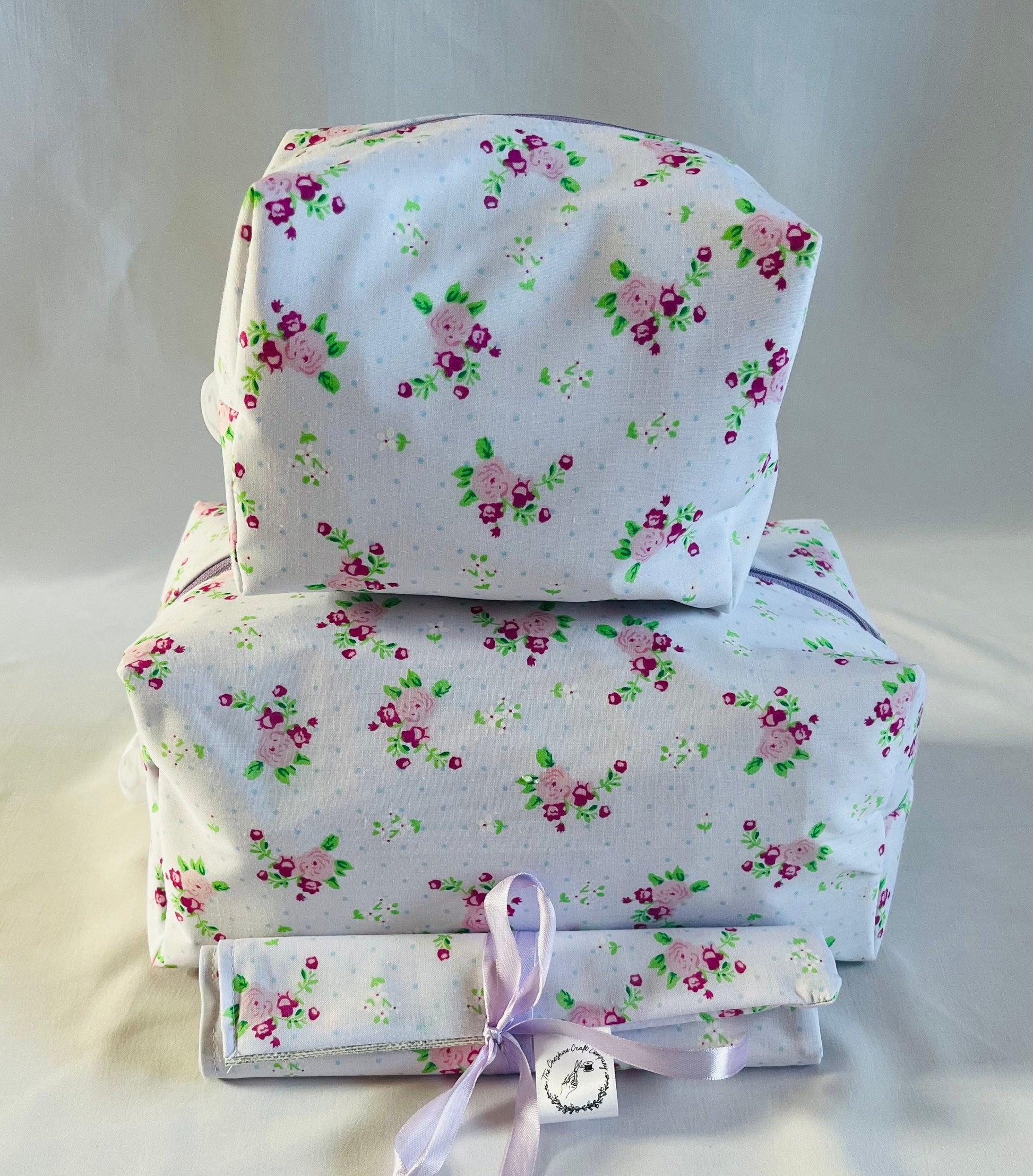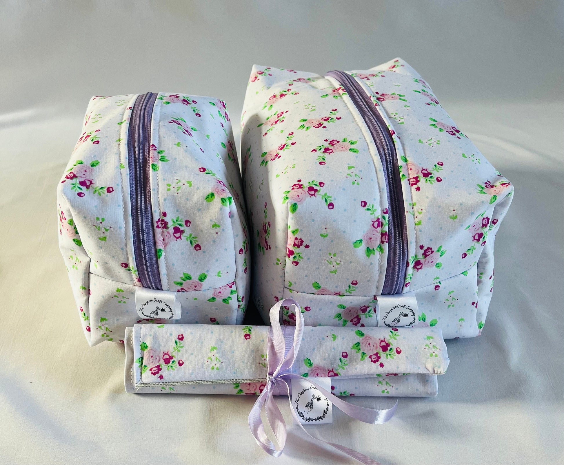 Our Purple Floral Print Travel Set is handmade in the UK from premium cotton fabric and lined with easy wipe PVC to protect against spills.