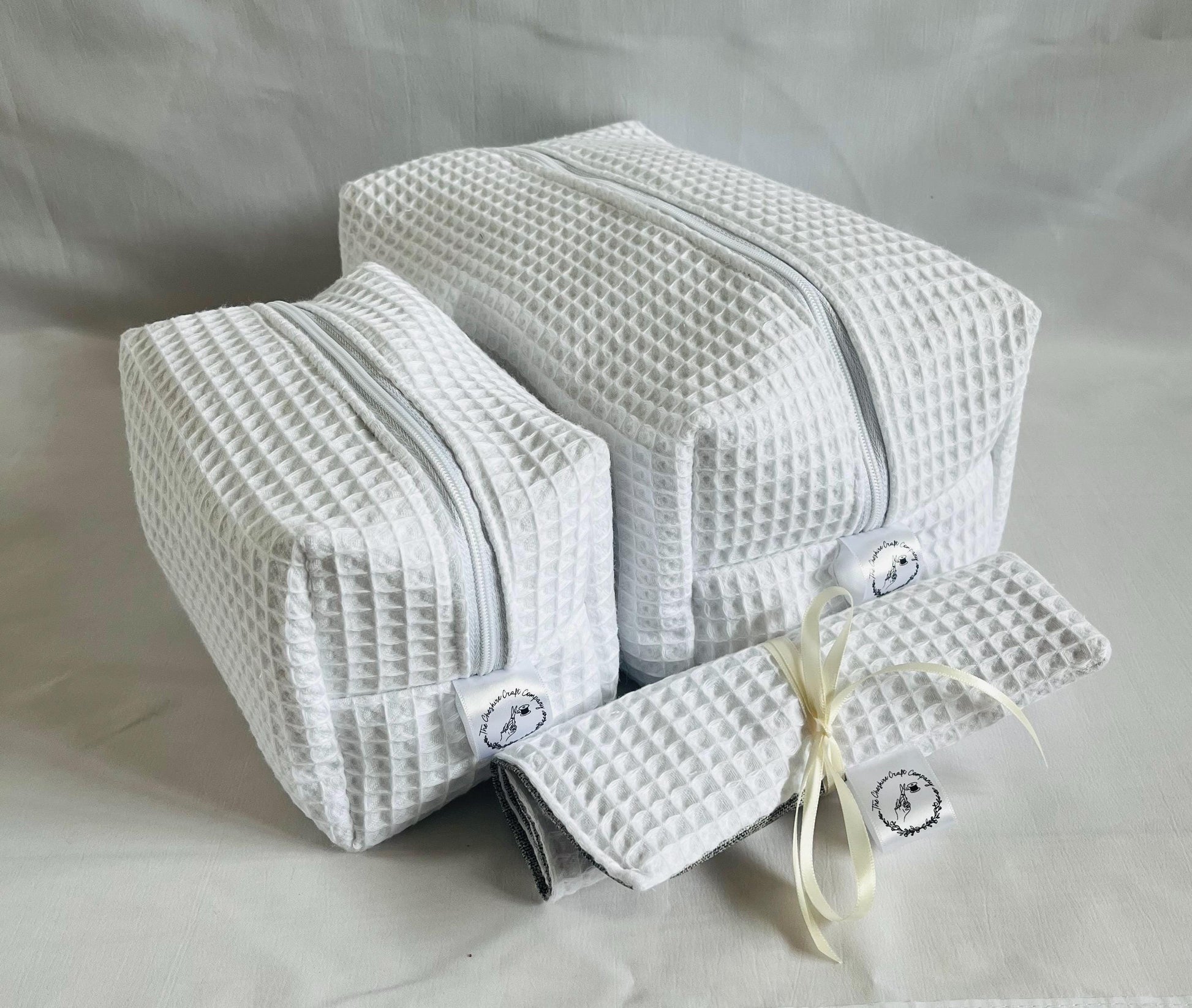 Elevate your travel routine with our White Waffle Travel Set, handmade in the UK from premium waffle/towelling fabric. This set includes a large wash bag, a small makeup bag, and a brush roll—perfect for keeping all your essentials organised in style.